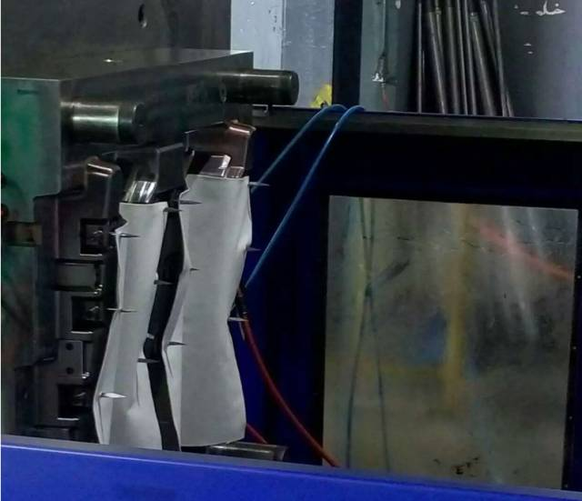 低壓注塑(sù)模具主要原理是注塑壓力較低在布上流動,開模時要先把布掛到前模掛針上,合模、注(zhù)塑、然後取件。