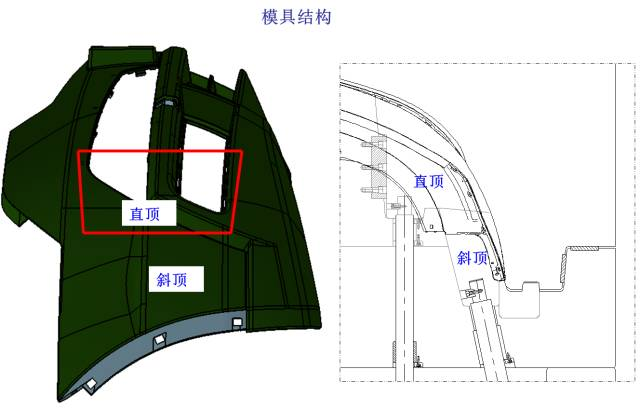 如下(xià)圖所示,產品兩頭采用直頂(dǐng)+斜頂的機構(gòu)進行脫模。