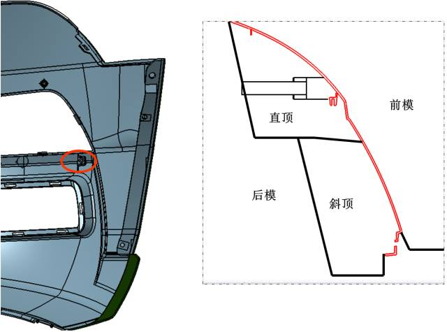 在汽車注塑模具中,針(zhēn)對汽車(chē)保(bǎo)險杠產品,模具設計時通常會采用先進的內分型麵技術。其優點是分型夾(jiá)線隱藏在保險杠的非外觀麵上,在汽車(chē)上裝配後看不到外觀夾線,不會影響產品外觀。但這種技術在(zài)難度與結構上都要比外分型保險杠複雜,技術風險也較(jiào)高,模具成本與模(mó)具價格也會高於外分型(xíng)保險杠很多,但因外觀美觀,在中高檔汽(qì)車中被廣泛應用。