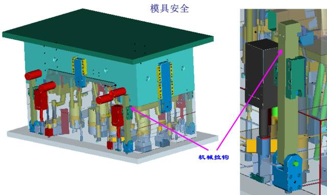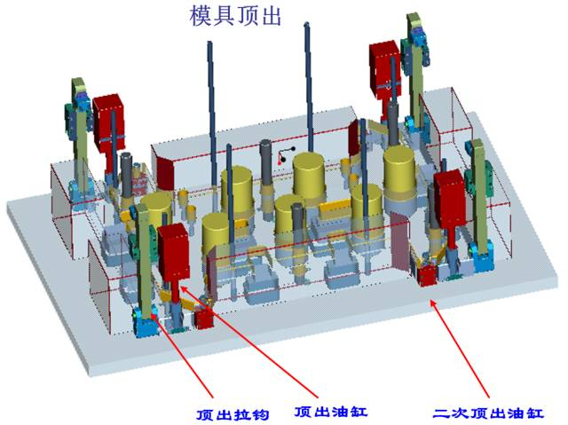 (1)第一級頂出采用4個油缸頂出同前模同步運(yùn)動頂出60MM,4個拉鉤為輔助(zhù)機構;